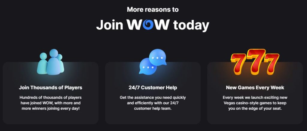 - WOW Wednesday: Celebrate WOW Wednesday at WOW Vegas and win 100 SCs weekly by responding to the WOW Wednesday post with #WowWednesday and your username